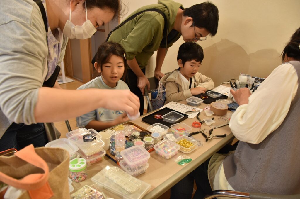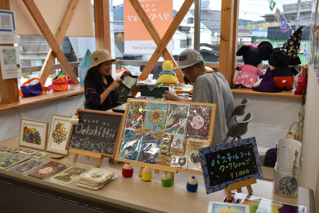 2階会場では、「アイシングクッキー」「木の実モンスターのハロウィンリース」「折り紙で作るミニポーチ」「自分だけのストラップ作り」「パステルアート」「りんごのシャカシャカキーホルダー」など様々な体験コーナーと、パンや和菓子の販売が行われていました。