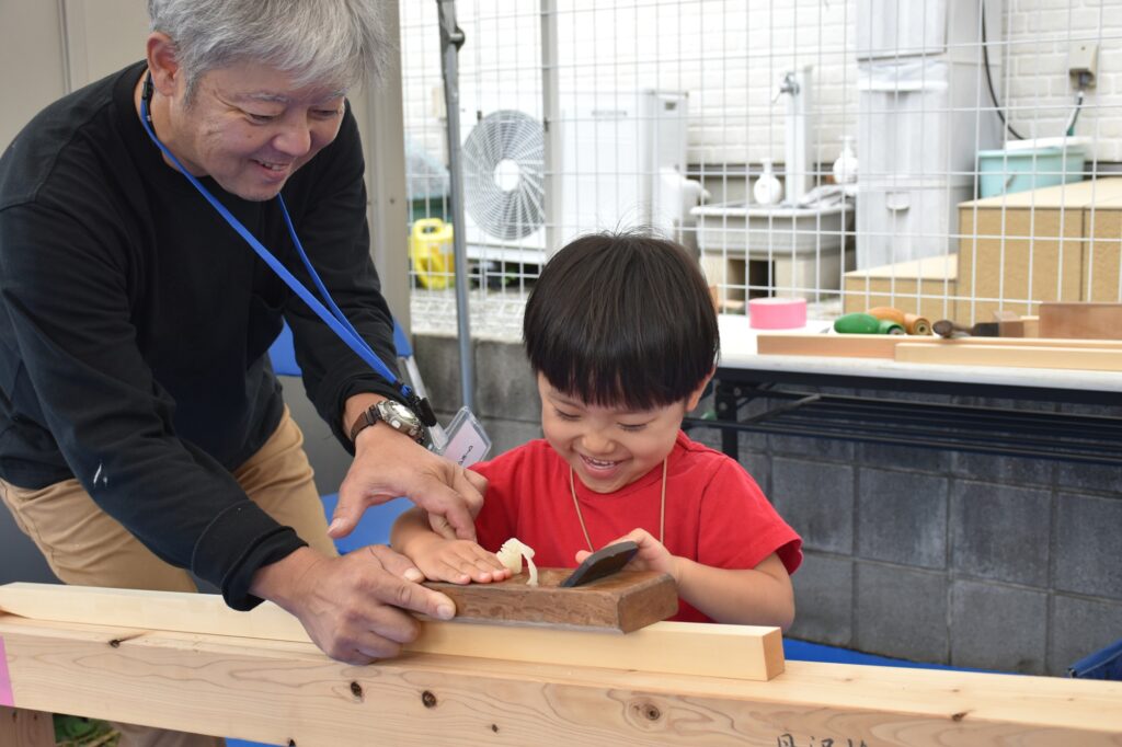 簡単なように見えて、かなりの力とコツが必要なのですが、削るたびに出てくる木くずに子どもたちも興味津々でした。