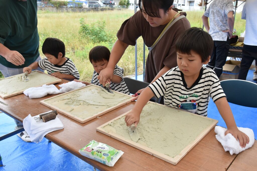 コテを使って塗り広げる作業に、子どもたちも真剣な表情。ものづくりの楽しさを体感してもらいました。