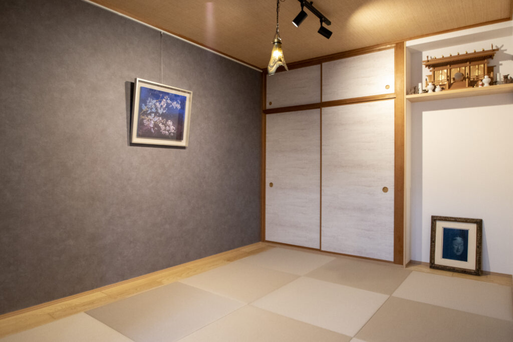 和室和室の壁一面にアクセントクロスを貼り、大切にされている桜の絵を中心に飾りました。絵を引き立てつつ部屋が暗くならないよう、落ち着いたダークグレーを採用しました。襖は優しいベージュの上品な光沢のある紙に張り替え、畳も「ダイケン健やかおもて」に交換しました。天井にはスポットライトを設け、桜の絵と空間をやわらかく照らしています。