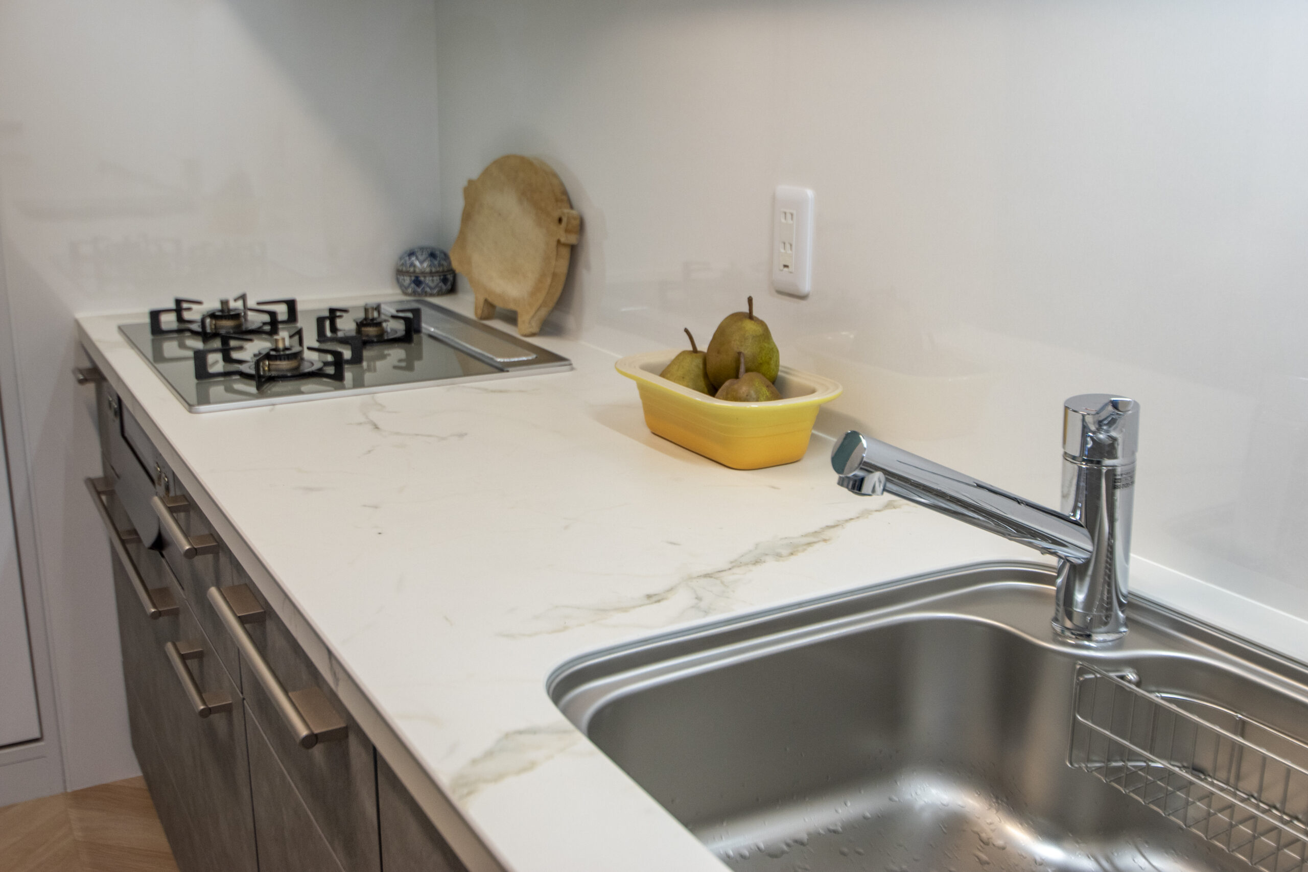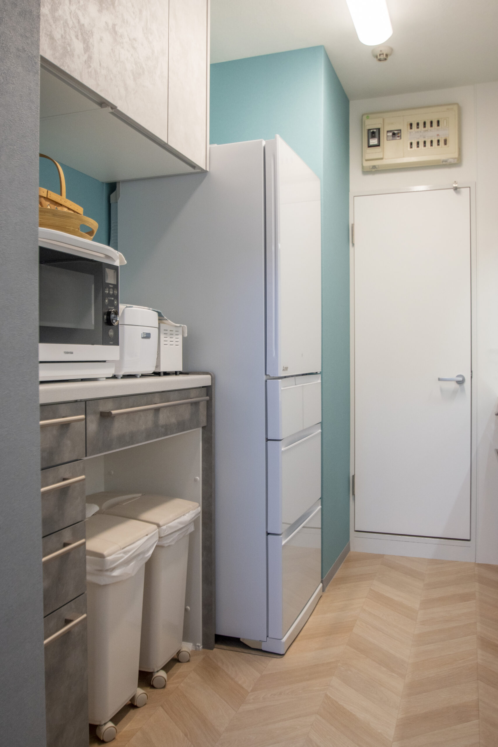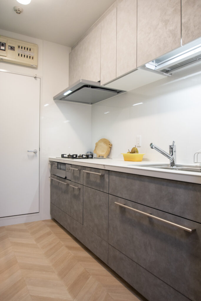 下台のキャビネットは落ち着いたグレージュスタッコ、上の吊戸棚は明るいホワイトスタッコで色の濃さにメリハリをつけ、すっきりと上品な印象に仕上げました。冷蔵庫側の壁にはターコイズブルーのクロスを貼り、さりげなく遊び心をプラスしました。