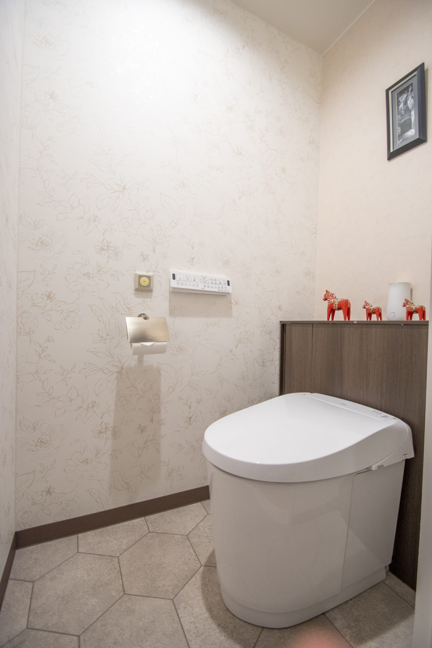 お客様が雑誌で見つけたお気に入りの空間イメージをもとに、壁紙や床の色を一緒に検討しました。大きめの壁紙サンプルとイメージパースで完成イメージを確認しながら、打合せを行いました。和室には大切にされている桜の絵が映えるよう、アクセントの壁紙や襖紙を選定しました。