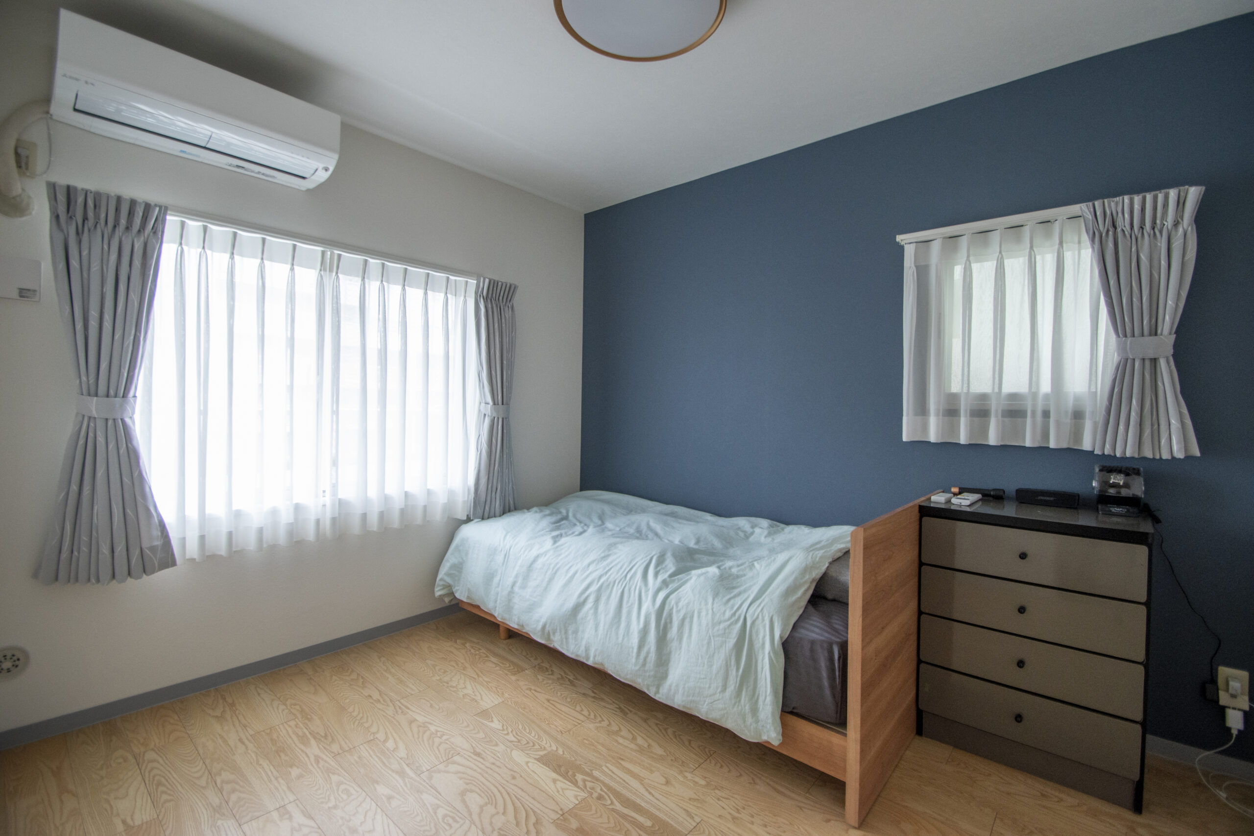 洋室の一面にはネイビーのアクセントクロスを採用しました。落ち着いた深みのある色合いで、クールでスタイリッシュな雰囲気に仕上げました。床は明るめのホワイトアッシュのフローリングで、アクセントクロスとのコントラストが映える空間です。