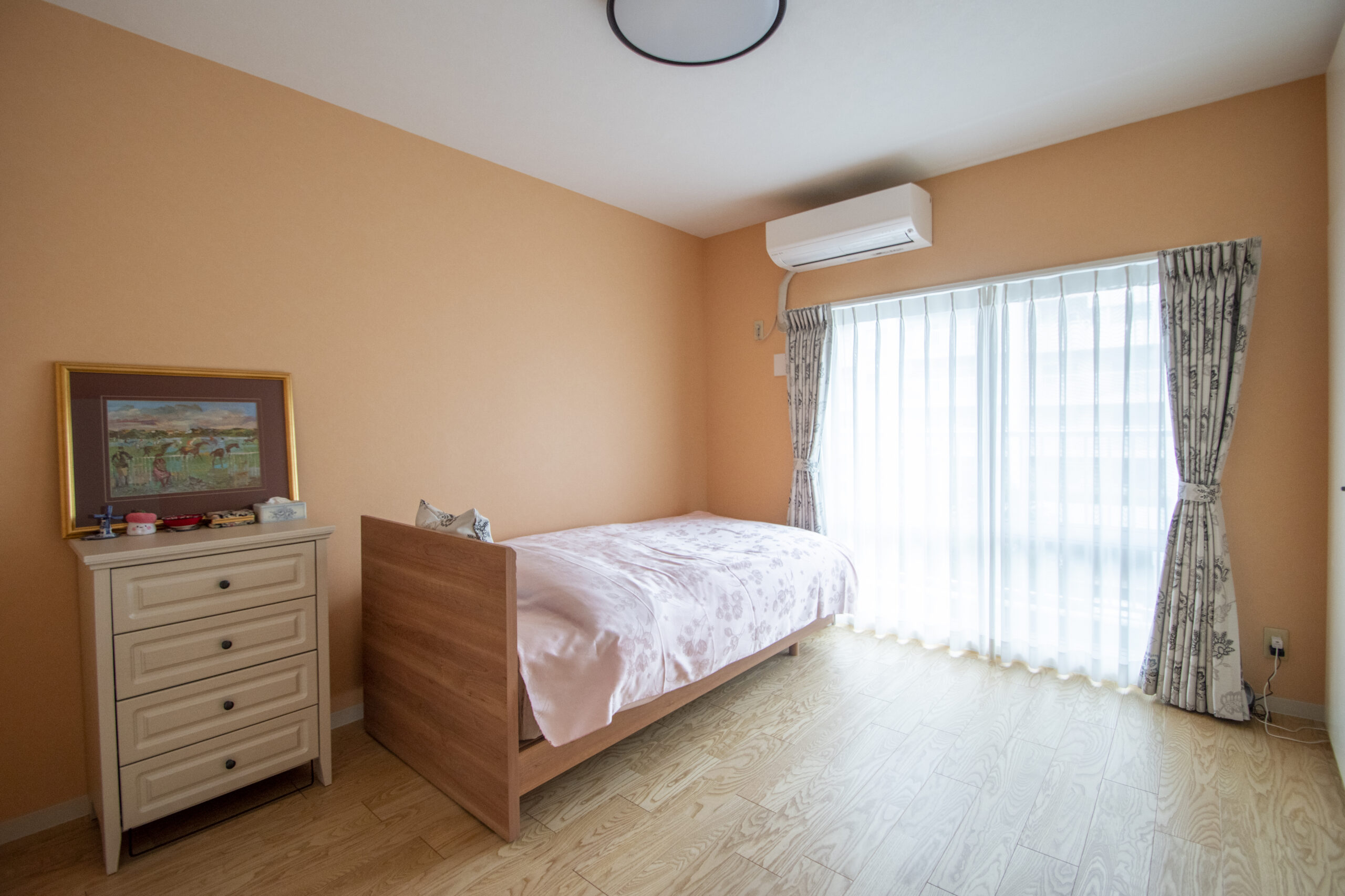 洋室には、奥様のご希望に合わせてシャーベットオレンジのクロスを採用しました。様々なオレンジの壁紙サンプルの中からお選びいただき、明るく華やかな空間に仕上げています。ぱっと目に入る色合いで、部屋に入った瞬間から気分が明るくなる、心地よいお部屋です。