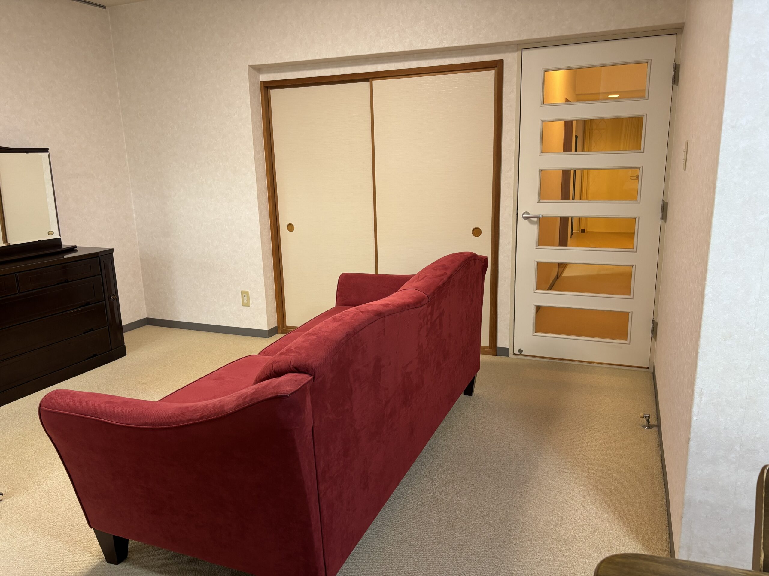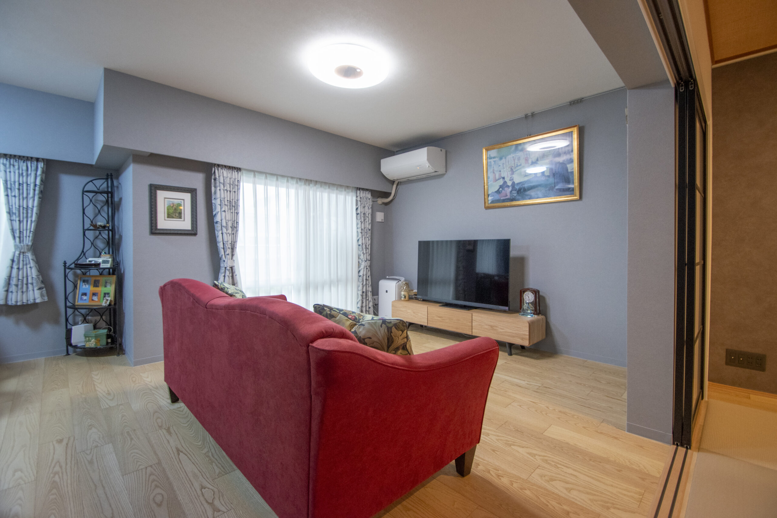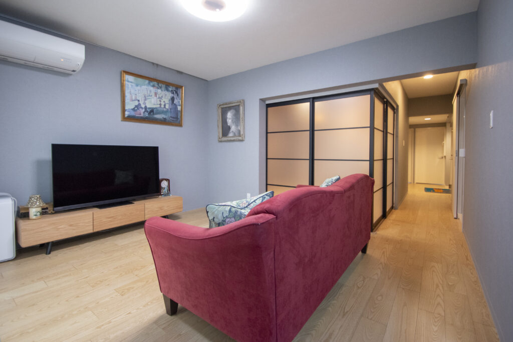 リビングの主役は、深みのある赤のソファです。このソファを中心に、壁紙やフローリングの色をコーディネートしました。リビングドアや和室との間仕切りを変更したことで、玄関から廊下へ入った瞬間にリビングからのやわらかな光を感じられるようになりました。家に入った一歩目から、空間の明るさと心地よさが広がります。