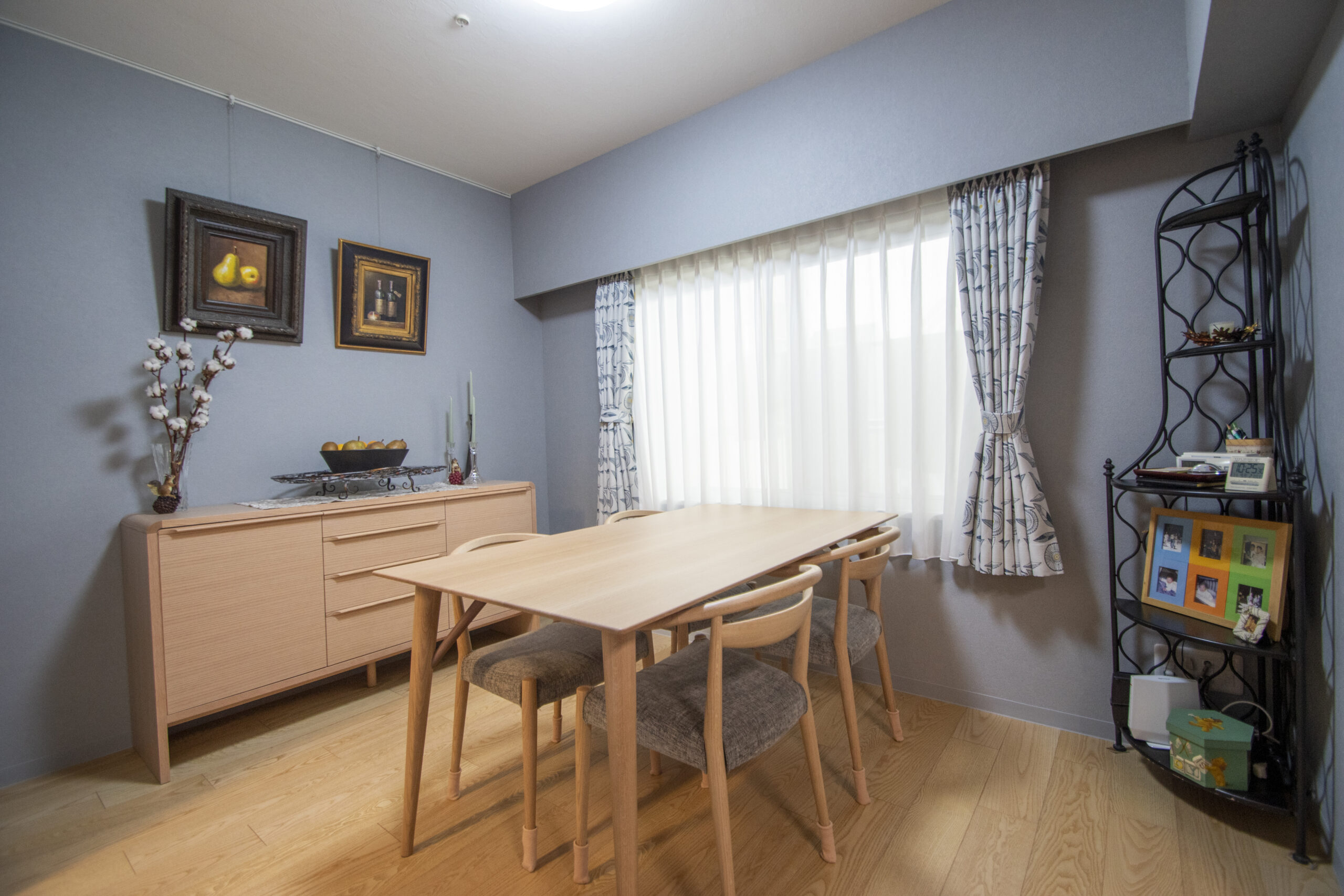 リフォームをきっかけに、明るい木目のダイニングセットに新調されました。壁際には奥様お気に入りの絵や季節の果物・オブジェを飾り、心が和むダイニングスペースです。 -