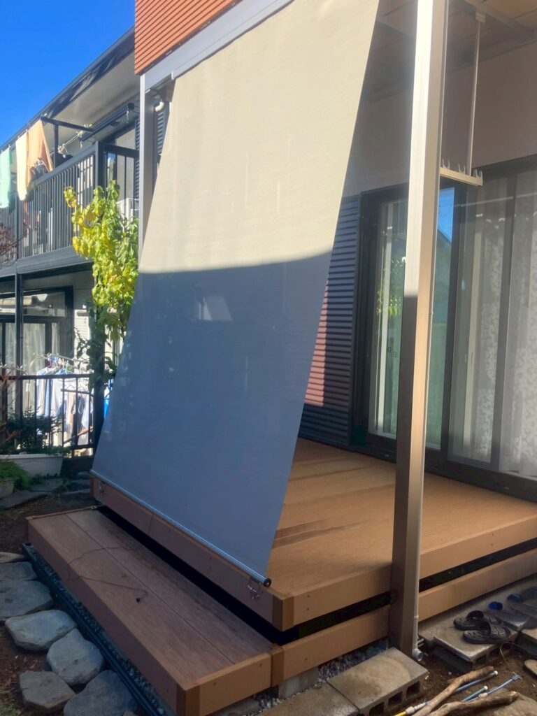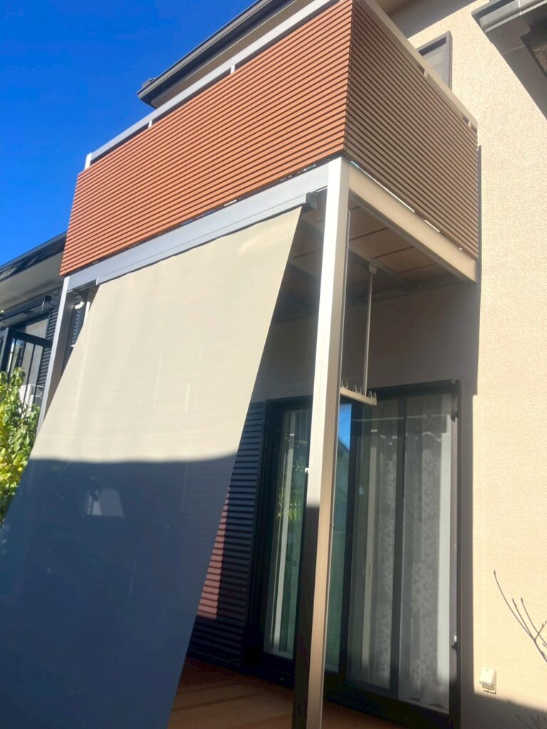 ウッドデッキバルコニー下にはアウターシェード(日よけ)を設置し、強い日差しをやわらかく遮ることで、夏の暑さ対策や室内への日射軽減につながります。あわせてYKK AP リウッドデッキ200EGを施工しました。天然木のような風合いがありながら、腐りにくくお手入れも簡単なデッキ材です。洗濯物の一時置きや、ちょっとくつろげるスペースとして使える、使い勝手の良いデッキ空間が完成しました。