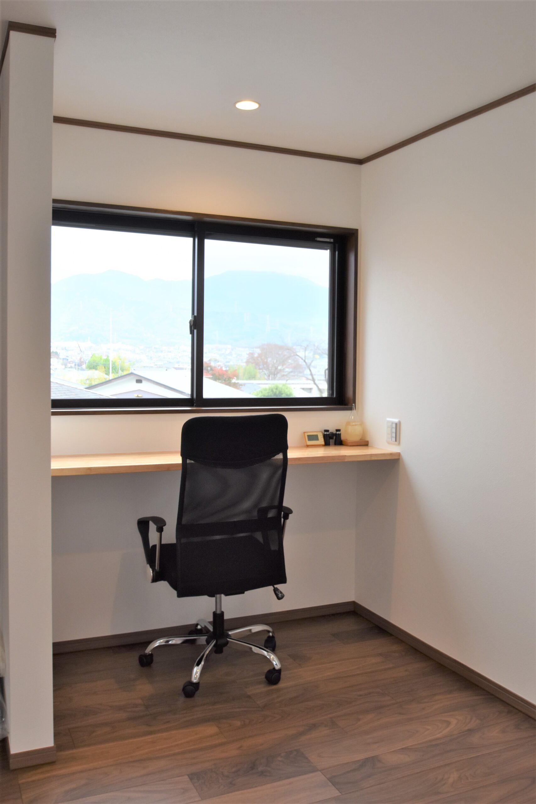 2階の寝室の一角に設けた見晴らしの良いワークスペース。丹沢の山の景色が眼下に広がります♪